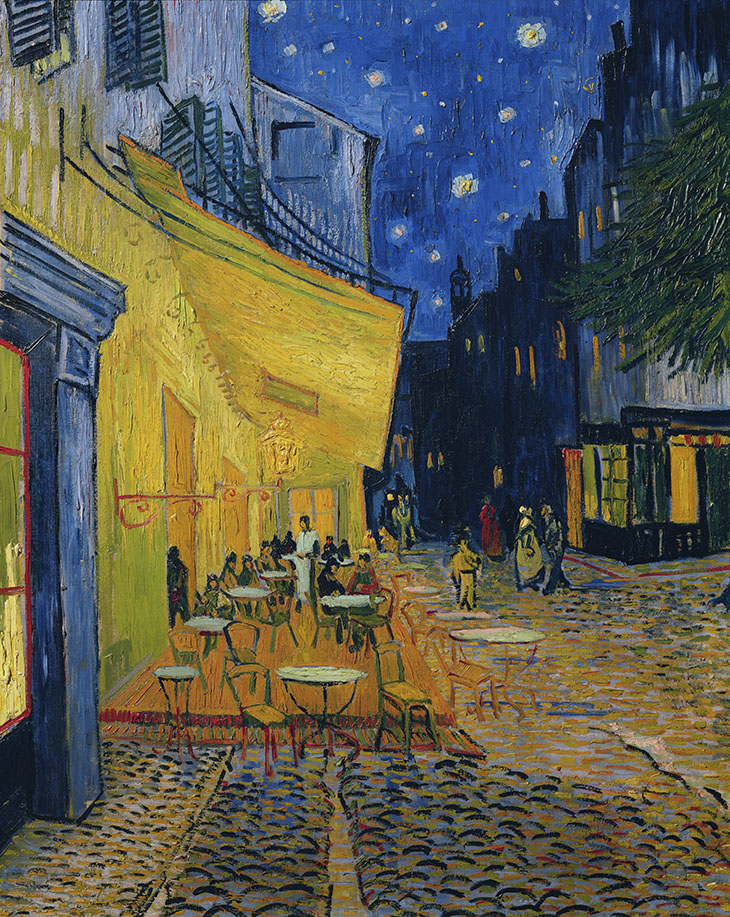 Nachtgemälde sind selten in der Malerei. Van Gogh geht diese Herausforderung auf unkonventionelle Weise an. Anstatt Schwarz- und Grautöne zu verwenden, setzt er eine Vielzahl von Farben ein. Seinem Bruder schrieb Vincent van Gogh begeistert, dass er dieses Bild ganz ohne Schwarz gemalt hat. Alle dunklen Töne, die den tiefen, dunkelblauen Kontrast zur der in Gelb erstrahlenden Markise bilden, sind selber gemischt. Van Gogh ist mit dem Effekt zufrieden: „Ich glaube, dass das helle Gaslicht, das ja Gelb und Orange ist, das Blau stärker hervorhebt.“