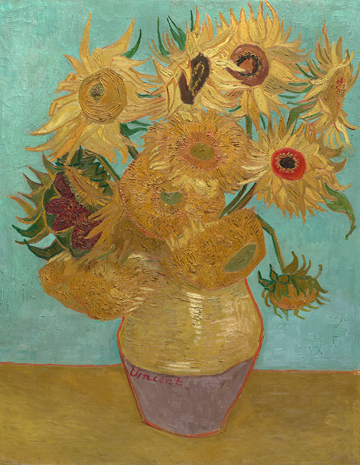Mit dieser Serie wollte Van Gogh demonstrieren, dass er ein Bild in zahlreichen Variationen mit nur einer einzigen Farbe gestalten kann. Van Gogh wählte hier erstmals Farbtöne, die über das natürliche ›Gelb-Spektrum‹ der Pflanze hinausgehen. Gelb mit Gelb und Gelb in Gelb – Vincent wollte, dass die Sonnenblumen in einem Raum so erstrahlen wie die Glasfenster in einer gotischen Kathedrale. Heute sind die Gelbtöne der Sonnenblumen stark verblasst.