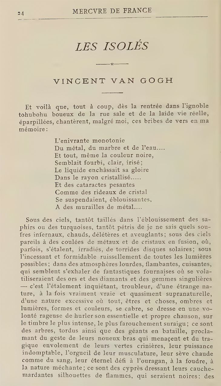 (Ausgabe: 29. Januar 1890, Artikel ›Die Isolierten‹, Seite 24–29)In diesem ersten mehrseitigen Artikel drückte der französische Kunstkritiker Albert Aurier (1865–1892) seine Bewunderung für Van Goghs unkonventionelle, leidenschaftliche und lebendig-künstlerische Kreationen aus.