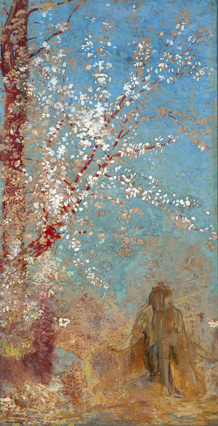 Ähnliches Motiv – gleiche Aussage. Odilon Redon nahm das Motiv der Mandelblüte und verstärkte die spirituelle Dimension aus Van Goghs Werk mit einer Buddha-Figur unter seinem Baum.
